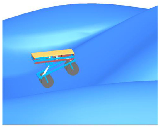The lateral rollover angles under both non-leveling and leveling conditions, calculated using Equations (15) and (17), are presented in Table 2. These findings validate that the design specifications are met—specifically, there is no rollover at the maximum lateral slope of 20°. Moreover, they demonstrate a significant enhancement in the rollover angle threshold as a result of leveling. This improvement facilitates an extension of the chassis’ operational limits regarding maximum lateral slope.