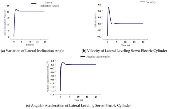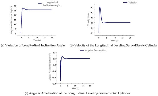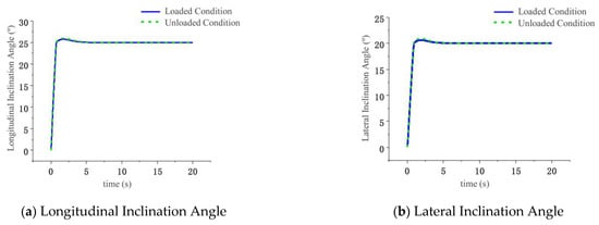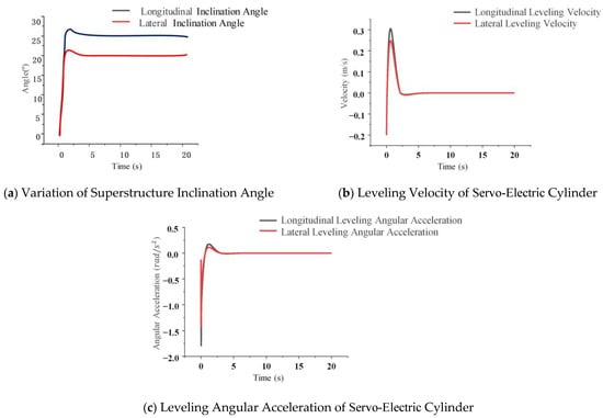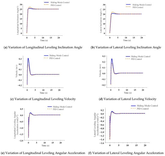 The static rollover threshold analysis presented in Section 2.2 demonstrates that the chassis structure possesses a high degree of inherent stability. This characteristic serves as a solid foundation for the adaptive sliding mode control (ASMC) strategy proposed in this study, enabling rapid and robust tracking performance. The significant stability margin provided by the mechanical design substantially expands the feasible design space for the control algorithm. To evaluate the leveling performance of ASMC in comparison with PID control, a co-simulation integrating electromechanical systems was performed under conditions of a 25° longitudinal slope and a 20° lateral slope. The comprehensive omnidirectional leveling performance is summarized in Figure 25.