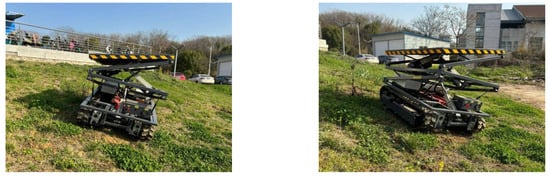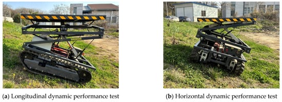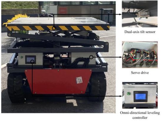 The prototype has a total weight of 800 kg, with dimensions of 1015 mm in height, 1500 mm in length, and 1200 mm in width. It is equipped with a 4 × 12 V 80 Ah lead-acid battery pack (Henan Jinma Storage Battery Co., Ltd., Xinxiang, Hena, China) mounted on the tracked agricultural chassis, which supplies power to both the locomotion and leveling systems, enabling a maximum travel speed of 3 km/h during operation. For posture sensing, dual-axis high-precision ZCT2XXKLCS-AH-XX-7XB tilt sensors (SHANGHAI ZHICHUAN ELECTRONIC TECH CO., LTD, Shanghai, China) are installed beneath the work platform and along the central axis of the chassis. These sensors offer a dynamic measurement accuracy of ±0.05°, allowing for real-time monitoring of the vehicle’s longitudinal and lateral inclination angles as well as the ground slope. The control system is centered around an electromechanical omnidirectional leveling controller based on the STM32F407ZGT6 microprocessor (STMicroelectronics N.V., Shanghai, China). It collects sensor data via CAN bus communication, processes the data using control algorithms, generates voltage control signals for the servo motors, and transmits these signals to the servo drives through dedicated circuits. The actuation system comprises four high-precision KDJ80-T10200-BR-PC-M5-P750 servo-electric cylinders (Shenzhen Kewei Machinery Equipment Co., Ltd., Shenzhen, Guangdong, China). Each cylinder features a designed stroke of 400 mm and is integrated with a 48 V DC servo motor rated at 2000 W, delivering a peak torque of 45 N·m. The system incorporates a ball screw mechanism with an 18 mm lead and a planetary reducer with a 5:1 reduction ratio, achieving a repeat positioning accuracy of ± 0.02 mm. This level of precision satisfies the requirements for high-frequency dynamic leveling on uneven terrain. The servo drives regulate motor rotation, which is converted into precise linear motion through the ball screw mechanism, thereby enabling dynamic leveling of the vehicle body. The prototype and associated components are illustrated in Figure 26.