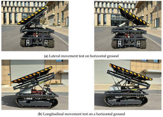 As illustrated in Figure 32a,b, during the omnidirectional leveling tests, both the lateral and longitudinal inclination angles of the chassis were adjusted to match the road slope—achieving a horizontal operating platform—within 3 s, even in the presence of abrupt slope changes. The system demonstrated rapid response to terrain variations. The dynamic tests exhibited high reproducibility, and through multiple experimental repetitions, the leveling process was confirmed to be both stable and reliable. These results validate the chassis’s effectiveness in improving attitude control and enhancing traveling balance performance.