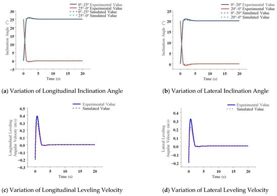 Figure 25c,d depict the velocity profiles associated with the leveling process for both the aforementioned configurations—longitudinal at 25° and lateral at 20°. The application of SMC results in a longitudinal velocity that is approximately 1.5 times greater, as well as a lateral velocity that exceeds those achieved through PID control by about 1.3 times.