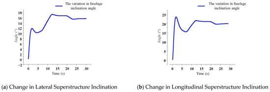 Figure 25a,b illustrate the variations in body inclination angles during longitudinal leveling at 25° and lateral leveling at 20°, respectively. With the implementation of sliding mode control (SMC), longitudinal leveling stabilizes within 2.47 s, which is an improvement of 1.12 s compared to PID control, while lateral leveling reaches stabilization in just 2.39 s, showing a reduction of 0.95 s relative to PID control. Furthermore, SMC effectively decreases the overshoot in both longitudinal and lateral inclination by 2.21° and 1.86°, respectively, when benchmarked against PID control.