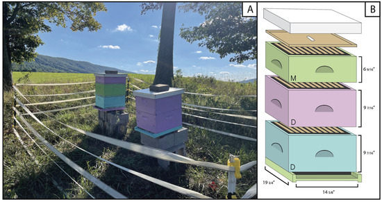 Apiary near a conventional pasture site (A) and dimensions of a 3-box hive (B).