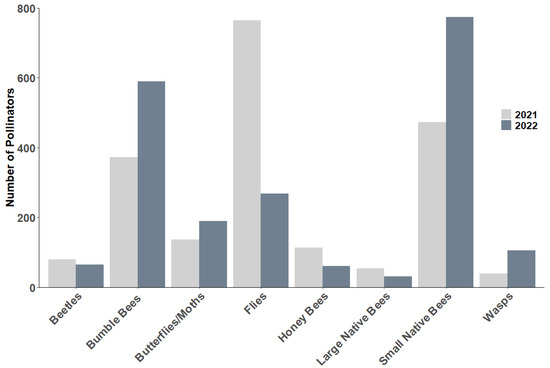 Total number of pollinator types observed in 2021 and 2022.