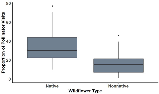 Lastly, our results provide evidence that although honeybees did not benefit substantially from native wildflower species in pastures, those species may have attracted more native pollinating insects compared with weedy, unsown species that emerged from the soil seed bank. In fact, each category of pollinator, except for nonnative honeybees, showed a statistically significant preference for one or more species of native wildflower. One caveat to note is that pollinator observations were carried out at three points during the growing seasons. Admittedly, the limited frequency of sampling events could have underestimated the scope of pollinator visitation at the sites. Nonetheless, our findings still support other studies demonstrating that native pollinators tend to have stronger preferences for native wildflowers compared with nonnative species [48,49,50].