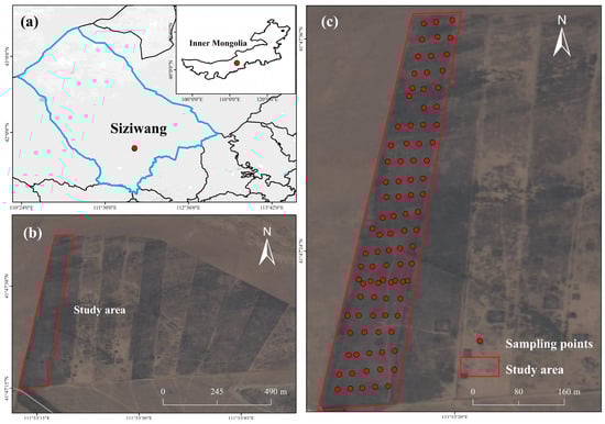 Study area and the spatial distribution of sampling points ((a) Location of the study area in Inner Mongolia, China; (b) true-color satellite image of the experimental area of the Inner Mongolia Agricultural and Animal Husbandry Research Institute, obtained from the satellite basemap in ArcMap (Esri, https://www.esri.com (accessed on 20 March 2025)); (c) grazing ban area of the experimental base, with sampling points shown as red dots, created using ArcMap version 10.8 (Esri, https://www.esri.com (accessed on 20 March 2025))).