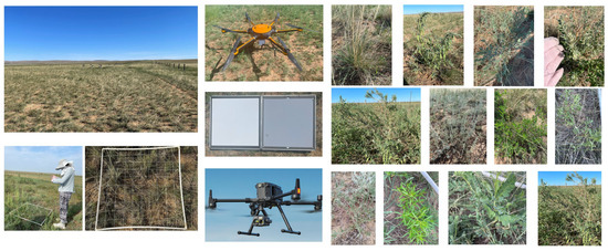 Representative field images showing the study environment, vegetation sampling by field staff, plot layout, the use of equipment such as UAVs and calibration panels, and selected vegetation images collected in situ.