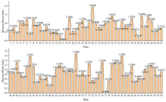 The Shannon index values were derived from canopy images collected during field surveys. For each plot, the relative abundance (Pi) of each species was calculated from the canopy images as the proportion of the species within the plot. Figure 3 shows the Shannon diversity index calculated for each sampling plot.