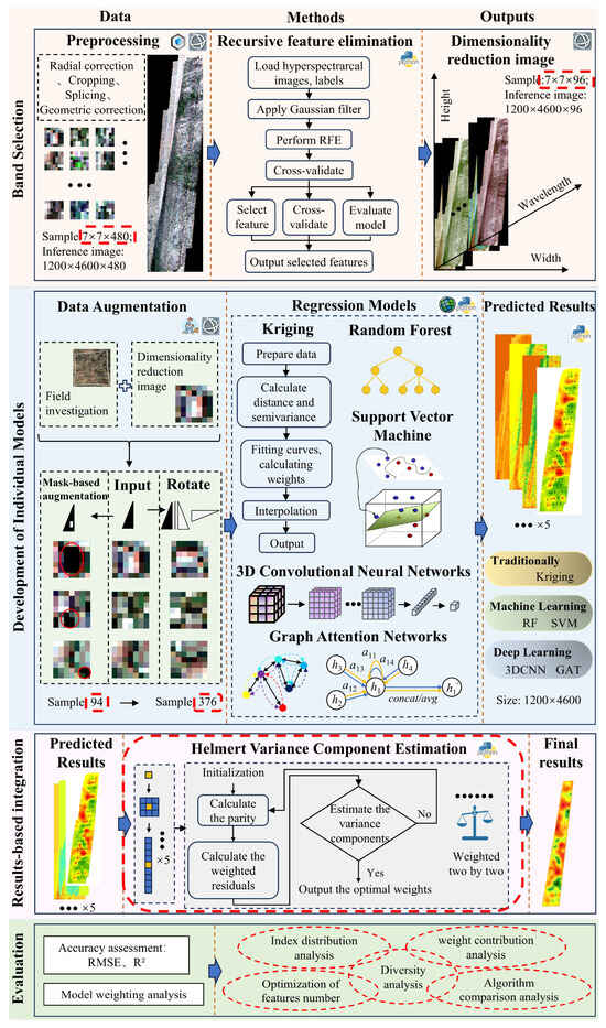The framework includes four main steps (Figure 4). First, 96 key bands were selected from 480 hyperspectral bands using recursive feature elimination (RFE) to optimize feature inputs and improve processing efficiency. Secondly, multiple individual models were developed based on the selected bands, including Kriging interpolation, RF, SVM, 3D-CNN, and GAT, to perform the initial inversion of the Shannon index. Third, Helmert variance component estimation was applied to calculate adjustment and update weights of the model outputs, integrating their strengths to produce the most accurate Shannon index predictions and construct the spatial distribution across the study area. Finally, the accuracy and weight contribution of each model were comprehensively evaluated to quantify the contribution of each model to the final predictions, thereby providing technical support for accurate regional biodiversity monitoring.