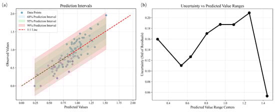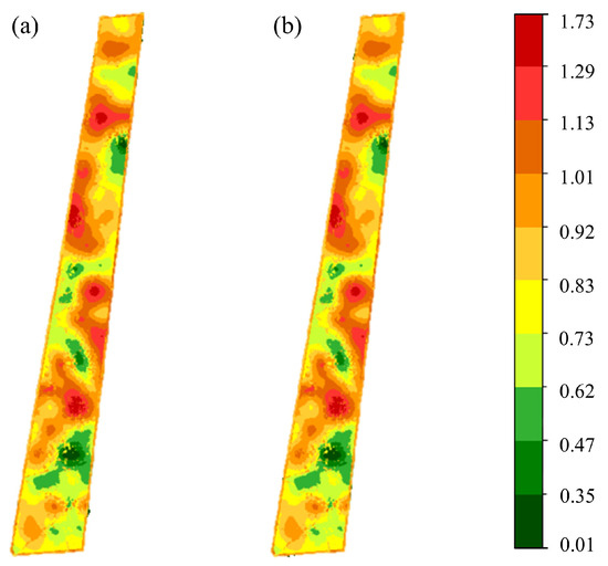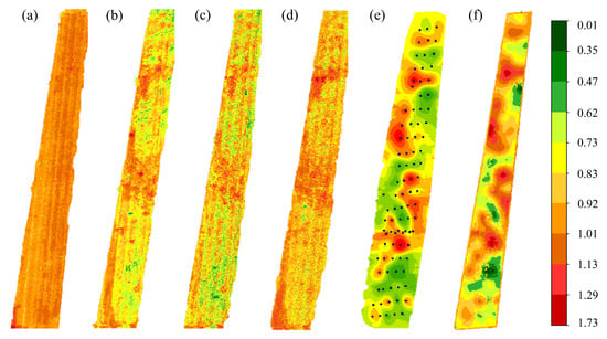 Figure 13 presents the spatial distribution of the Shannon index predicted using each method. Figure 13f shows the results of the integrated method (weighted mean) based on Helmert variance component estimation. Figure 13a (SVM) shows that the predicted values exhibit limited spatial variation, with most areas in orange-yellow and only a few sample points in yellow-green or red, reflecting the influence of training data. Figure 13b (RF) shows slightly more pronounced than in SVM, but remains largely within the yellow-green to orange range, indicating limited change in predicted values. This reflects the limited capability of traditional machine learning algorithms in handling high-dimensional data and capturing the nonlinear and spatial features of hyperspectral imagery, resulting in restricted variation in predicted values. In contrast, the predicted value variations in Figure 13c (3D-CNN) and Figure 13d (GAT) are more pronounced, with values mainly ranging from 0.5 to 0.9. Most of Figure 13d (GAT) displays yellow and orange colors, consistent with the mean prediction of 0.8735 shown in Figure 13, where 57% of plots are near the mean. The prediction results of Figure 13c,d exhibit strong spatial patterns across the study area, although local accuracy near sample points is slightly lower. This reflects the strength of deep learning models in capturing global features of hyperspectral data, which is important for enhancing large-scale prediction performance. In the prediction map of Figure 13e (Kriging), local extremes (e.g., peaks and troughs) and contour-like spatial structures are clearly visible, fully demonstrating the geostatistical model’s capability in capturing spatial continuity. However, as expected from theory, prediction reliability decreases in areas distant from the sample points.
