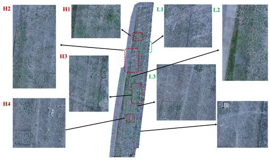 - High-resolution RGB orthophotos were captured using the DJI M300 UAV at a flight altitude of 30 m and speed of 3 m/s (Table 1). Use DJI Zhitu software to generate orthophotos covering the entire test area. These orthoimages are primarily employed for the geometric correction of hyperspectral images, as well as for determining the corresponding positions of sample points in hyperspectral images during the cropping process.