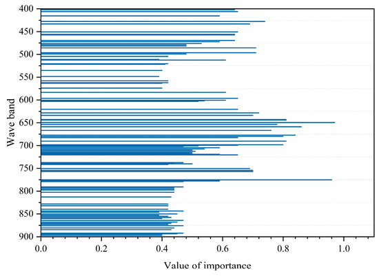 As shown in Table S1 and Figure 14, the 96 selected bands are primarily concentrated in the red light (RL) and near-infrared (NIR) regions, with the highest importance scores observed around 650 nm and 760 nm. This indicates that the RL and NIR bands play a crucial role in reflecting the chemical composition and vegetation characteristics in plant tissue spectral analysis. The band near 650 nm is significant due to strong chlorophyll absorption of incident light, whereas the band near 760 nm corresponds to a sharp increase in reflectance, providing essential information on vegetation status. Additionally, some blue and green light bands were retained. The blue band is important given chlorophyll’s pronounced absorption in this region, as established in early vegetation index studies. The green band, with a relatively lower absorption coefficient, allows deeper light penetration into leaf tissues and multiple scattering among cell walls, thereby more effectively reflecting the structural characteristics and growth conditions of vegetation leaves.