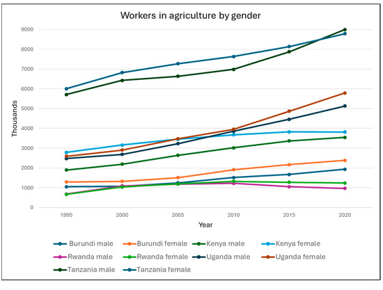 It is estimated that in sub-Saharan Africa, around 66% of women’s employment is in agrifood systems and it is their main source of livelihood [41]. Although, some authors have reviewed individual countries and found that the percentage is less to even 24% in Niger and 37% in Nigeria [42]. Figure 1 shows the trends by area and sex from 1995 to 2020. Each line represents a country’s male or female population’s trend in the agrifood sector in key selected countries in East Africa.
