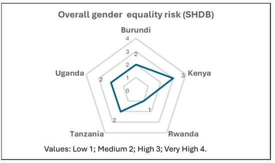 The assessment for risks for gender inequality in the five countries showed that Burundi scored as medium risk for the overall gender equality risk across the three sectors, while for the Global Gender Gap Index it was scored as low risk across the sectors, and in the gender inequality risk it was scored as high risk in the three sectors. For all indexes and sectors, Kenya showed a high risk.