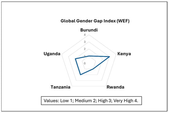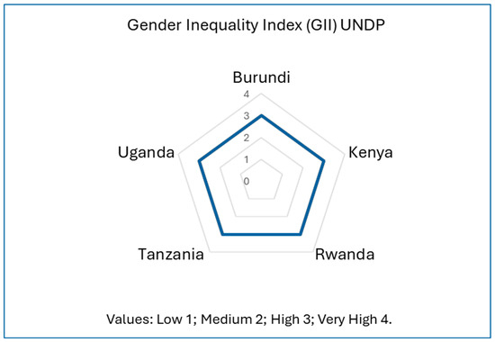 According to the 2023 UNDP report on the Gender Inequality Index (GII), Kenya, Rwanda, Uganda, and Tanzania are classified as countries with medium scores for the Human Development Index. The GII values highlight gender inequality in these nations (where a lower GII value signifies less inequality) (Table 4). Out of 170 countries, the data reveals that these selected countries still exhibit a gender gap. However, Rwanda stands out in the region with a relatively better ranking.