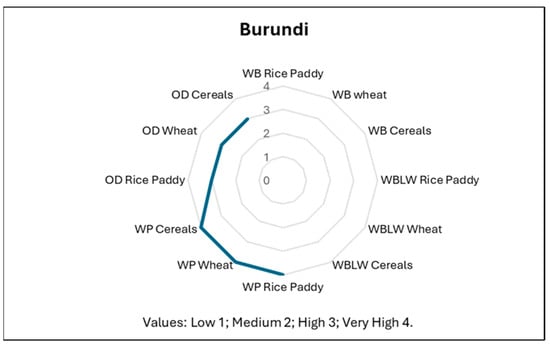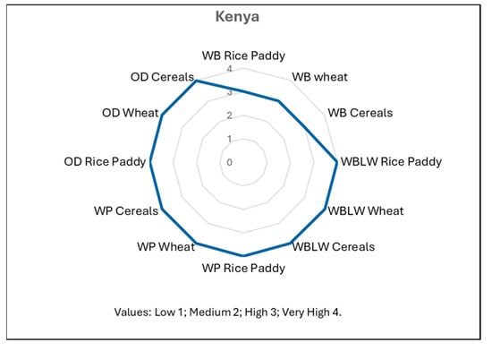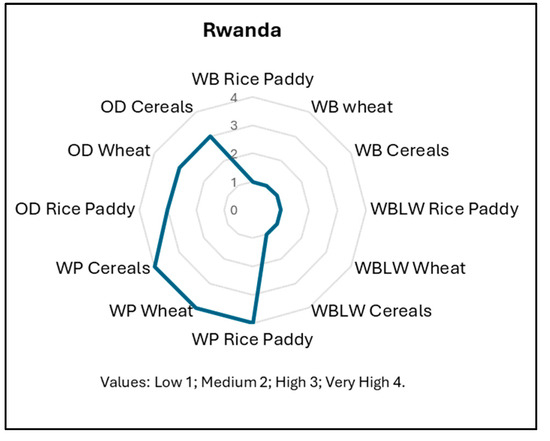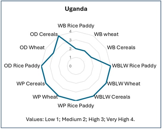 Finally, Uganda’s assessment showed medium risk for minimum wage below the benchmark in the three sectors (Figure 10). The assessment showed very high risk for wages below living wages, workers in poverty, and discrimination across all sectors, except the wheat sector, for which overall discrimination was scored as being high (3). This difference with the wheat sector may be due to the farming system in Uganda. Wheat is not a staple food like maize (included in the cereals sector) and rice. It is becoming an economic crop but is not yet of great economic importance. The production of maize in 2024–2025 was of 5 Mt versus 25 thousand tons in the same year. Furthermore, wheat is not cultivated at household farm level [49].