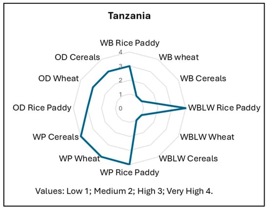 Tanzania was the only country that showed differences across the sectors. For the minimum wage below the benchmark, it showed a high risk for the paddy rice sector and a low for wheat and cereals; for the wages below living wages, it showed a very high risk for paddy rice and low risk for wheat and cereals. For the overall discrimination against workers, it showed a high risk, with no difference across the sectors (Figure 9).