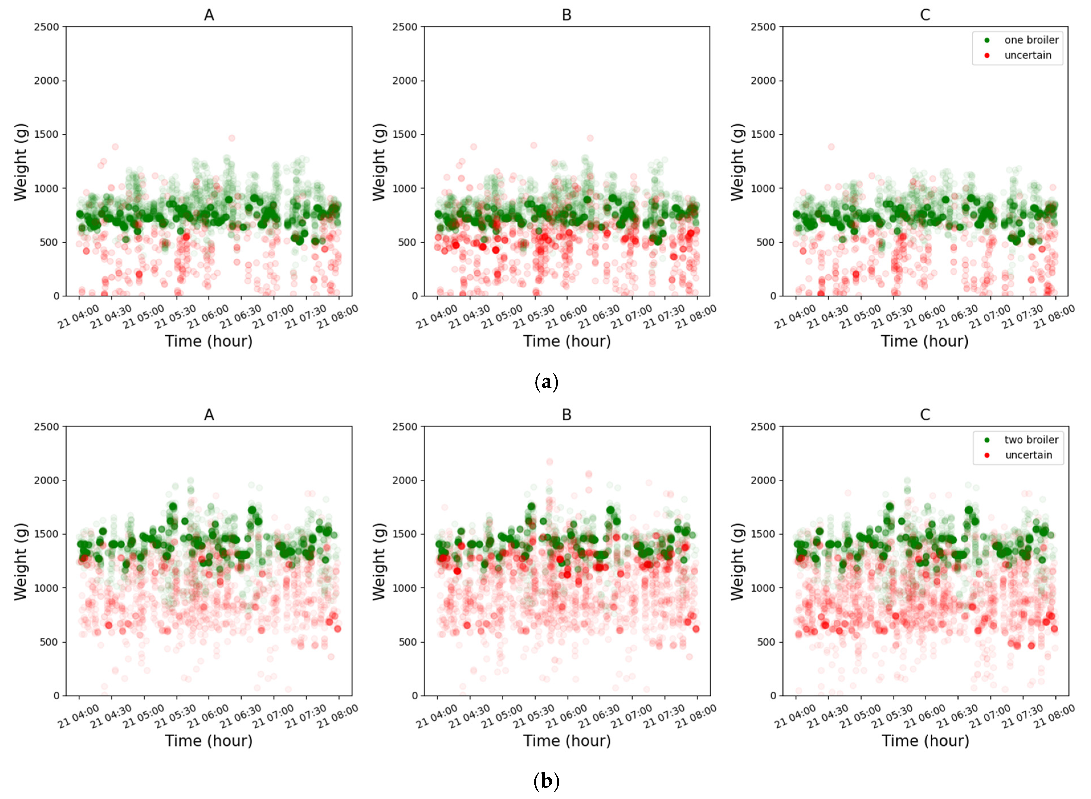 - Liu, D.; Vranken, E.; Van Den Berg, G.; Carpentier, L.; Fernández, A.P.; He, D.; Norton, T. Separate Weighing of Male and Female Broiler Breeders by Electronic Platform Weigher Using Camera Technologies. Comput. Electron. Agric. 2021, 182, 106009. [Google Scholar] [CrossRef]