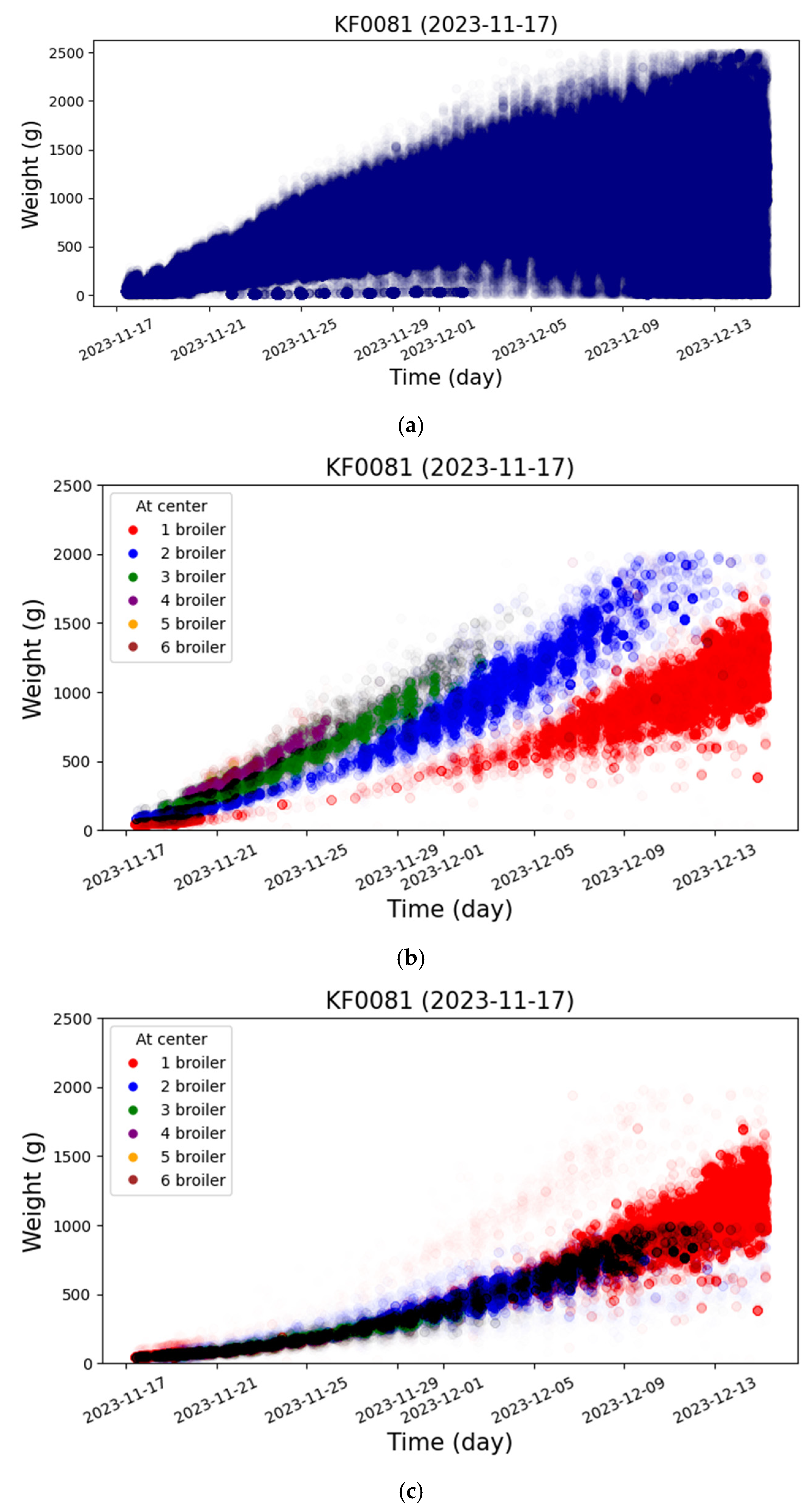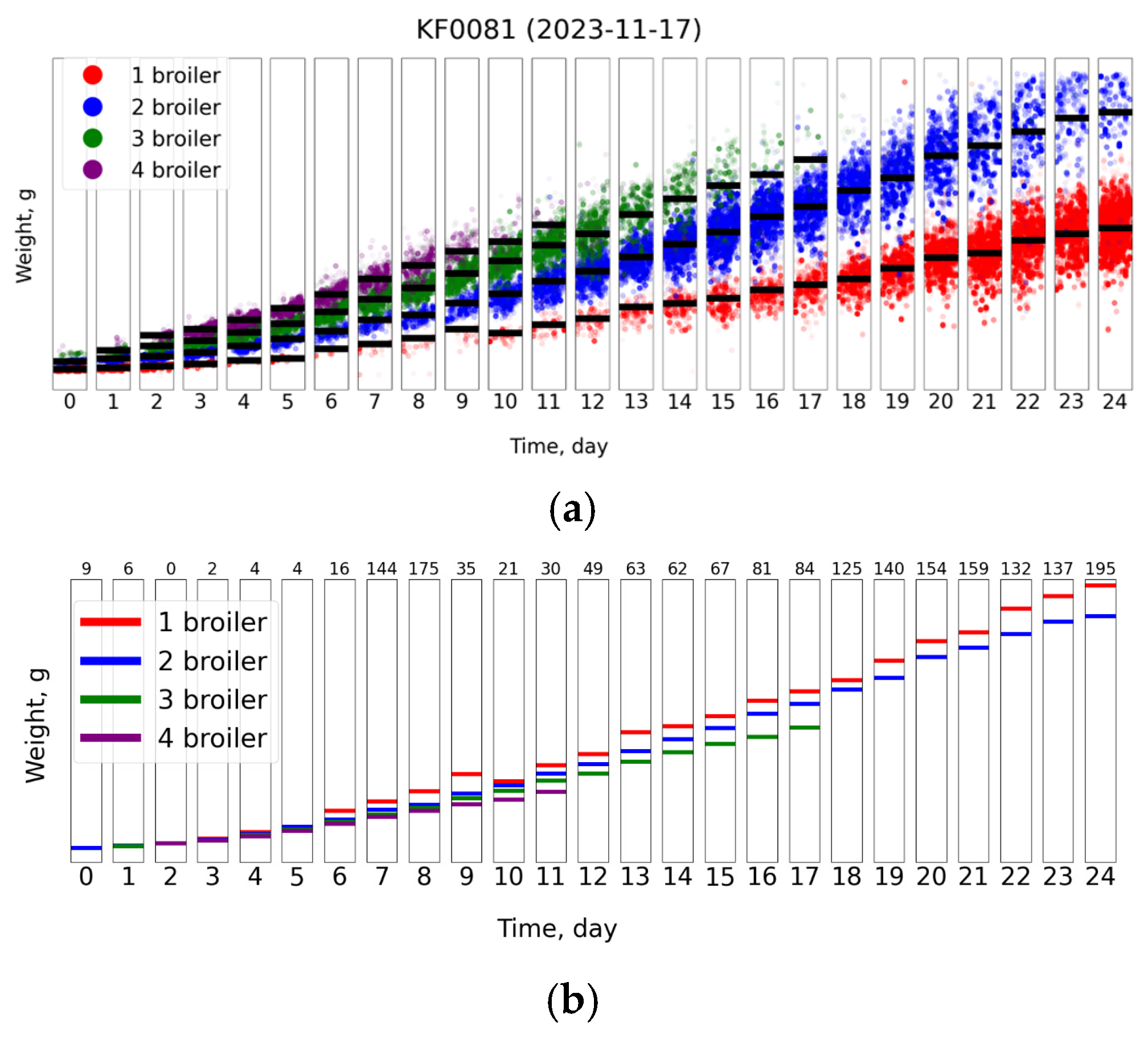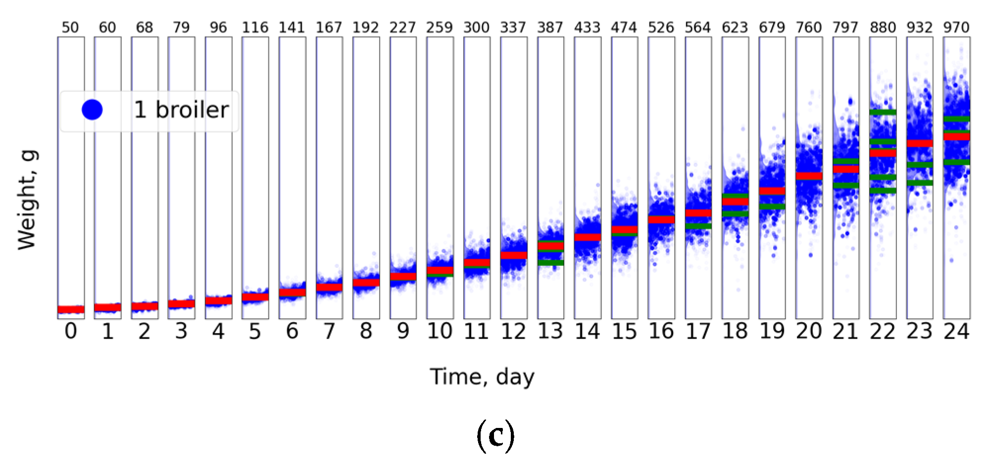 - Oh, Y.; Lyu, P.; Ko, S.; Min, J.; Song, J. Enhancing Broiler Weight Estimation through Gaussian Kernel Density Estimation Modeling. Agriculture 2024, 14, 809. [Google Scholar] [CrossRef]