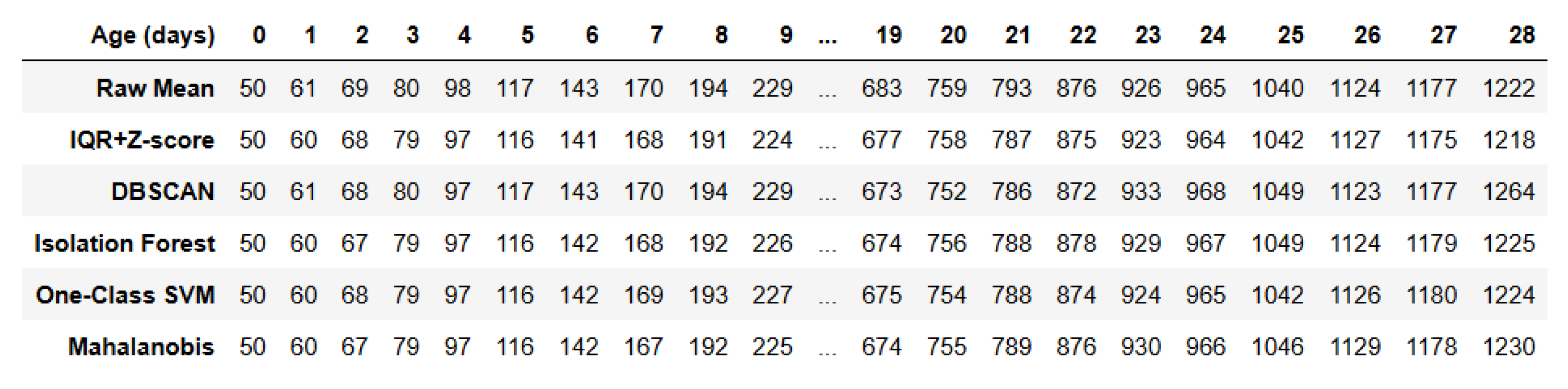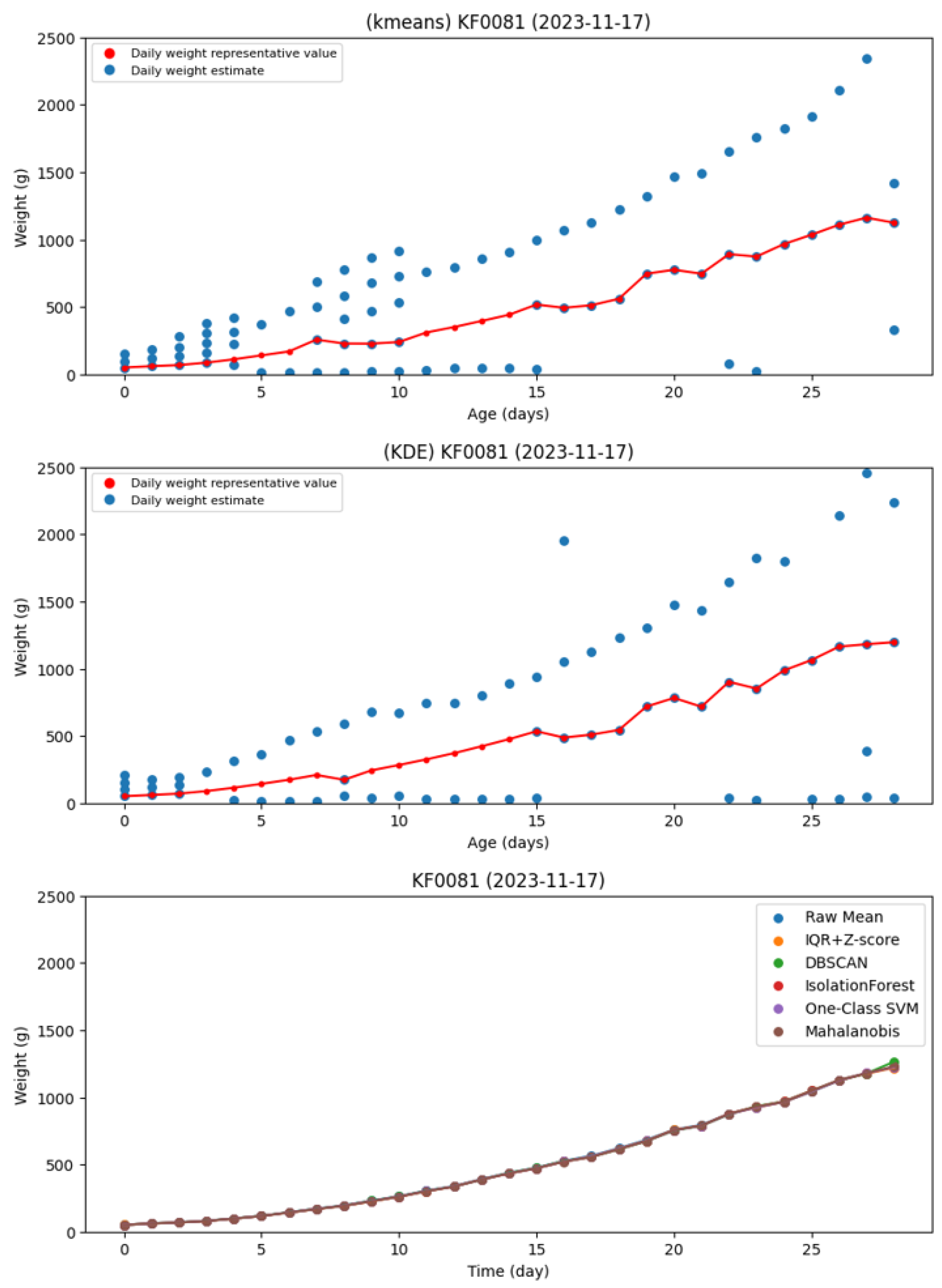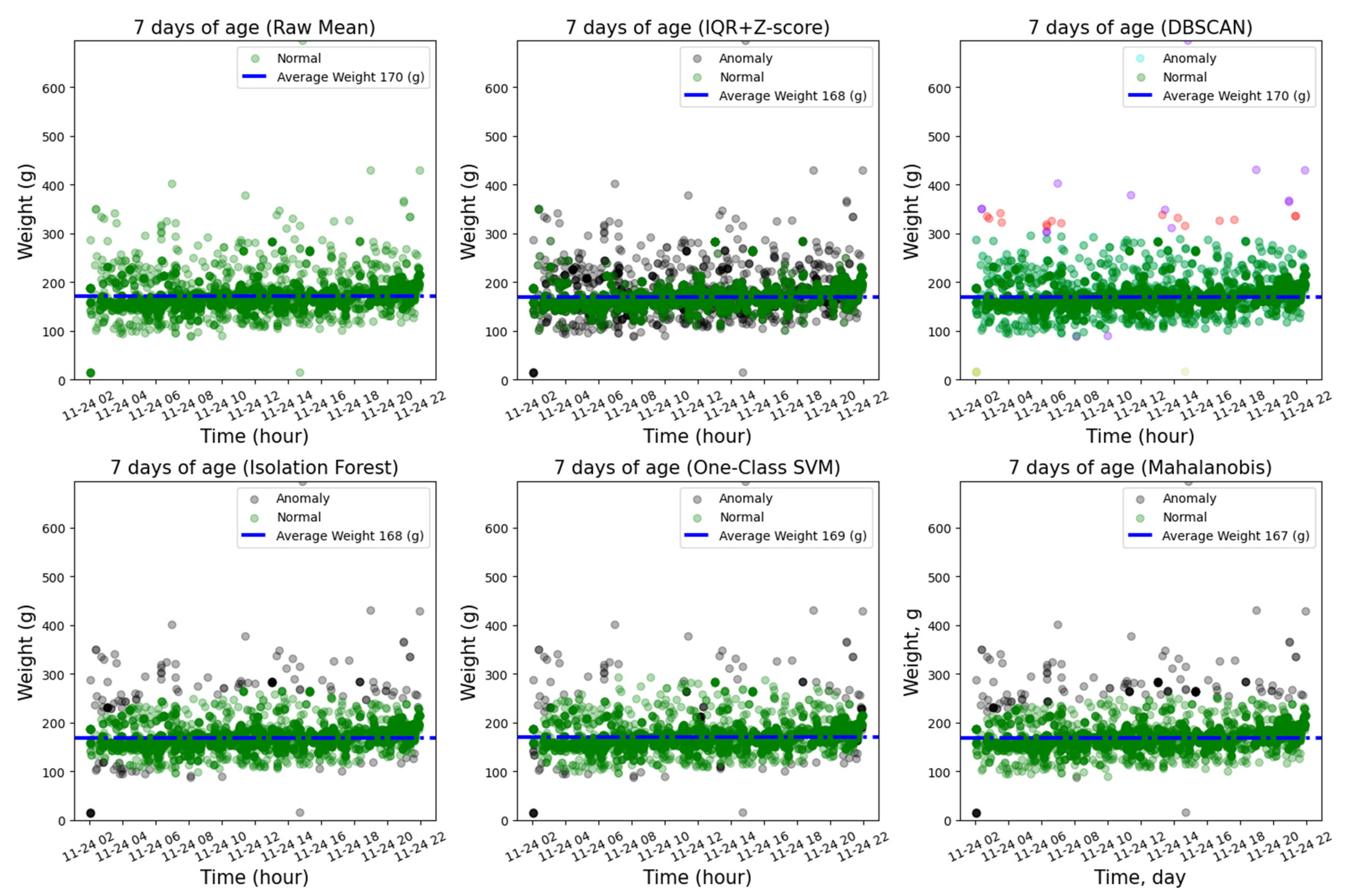 Data | K-Means | KDE | Raw Mean | IQR + Z-Score | DBSCAN | Isolation Forest | One-Class SVM | Mahalanobis | Avg. Weight (g) |