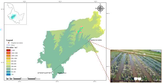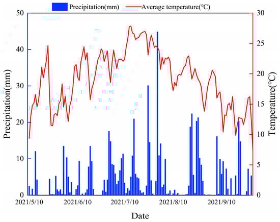 The field experiment was conducted at the Rice Irrigation Experimental Station (127°40′45″ E, 46°57′28″ N) in Heilongjiang Province, China (Figure 1). The site is located in the core area of the cold-region black soil zone of China with distinct seasonal variations; the annual average temperature is 3.6 °C, the annual precipitation is 543.5 mm, the average relative humidity is 67%, the annual sunshine duration is 2682.4 h, and the annual accumulated temperature is 2755 °C. The meteorological data of the test season are shown in Figure 2 below, and the frost-free period lasts for about 143 days. The physicochemical properties of the topsoil at the experimental site are as follows: pH value of 6.73, organic matter content of 25.68 g/kg, total nitrogen content of 15.1 g/kg, total phosphorus content of 15.61 g/kg, total potassium content of 19.86 g/kg, and available nitrogen content (alkali-hydrolyzed nitrogen) of 148.27 mg/kg. The field capacity of the 0–20 cm soil layer in the experimental area is 29%, and the wilting coefficient is 0.093 [16]. The soil in the experimental field is mainly of the Mollisol type, and the soil texture in the 0–20 cm soil layer is uniformly sandy clay. For the 0–20 cm, the sand content is 36.7%, the silt content is 31.8%, and the clay content is 29.5% [17].