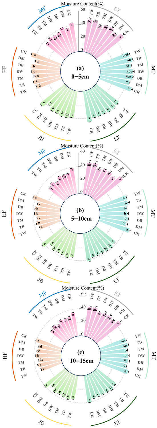 4.1. Soil Moisture Content Changes Under Different Treatments