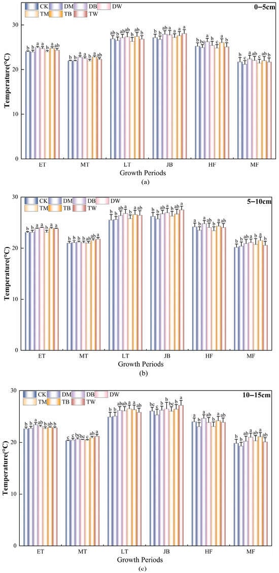 Soil temperature at different depths under various treatments. (a) Soil temperature at the 0–5 cm soil layer under different treatments; (b) Soil temperature at the 5–10 cm soil layer under different treatments; (c) Soil temperature at the 10–15 cm soil layer under different treatments. Different lowercase letters indicate significant differences between treatments at p < 0.05. Error bars indicate SE. ET, early tillering stage; MT, mid-tillering stage; LT, late tillering stage; JB, jointing–booting stage; HF, heading–flowering stage; MF, milk grain-filling stage.; CK, traditional irrigation and no mulching; DM, ridge irrigation and no mulching; DB, ridge irrigation and black biodegradable film mulching; DW, ridge irrigation and white biodegradable film mulching; TM, controlled irrigation and no mulching; TB, controlled irrigation and black biodegradable film mulching; TW, controlled irrigation and white biodegradable film mulching.
