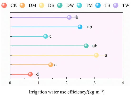 IWUE under different treatments. Different lowercase letters indicate significant differences among treatments at p < 0.05. Error bars indicate SE. CK, traditional irrigation and no mulching; DM, ridge irrigation and no mulching; DB, ridge irrigation and black biodegradable film mulching; DW, ridge irrigation and white biodegradable film mulching; TM, controlled irrigation and no mulching; TB, controlled irrigation and black biodegradable film mulching; TW, controlled irrigation and white biodegradable film mulching.