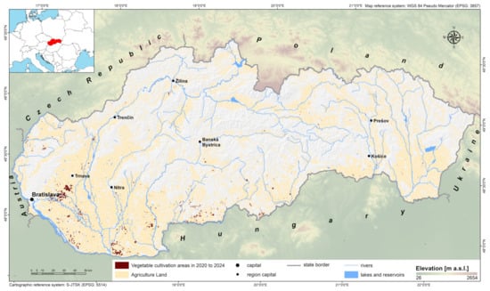 Historically, vegetable cultivation in Slovakia has primarily occurred in warmer areas, such as lowlands and protected floodplains, located at altitudes ranging from 100 to 350 m above sea level (m.a.s.l.) with an average annual temperature of 8 to 10 °C. The main regions of vegetable production were situated/spread around the Morava, Danube, and Váh rivers and are still predominant in the southern part of Slovakia, mainly within the lowlands, hilly country, and valleys. Between 2020 and 2024, vegetable cultivation was concentrated in the southwestern part of Slovakia (Figure 1).