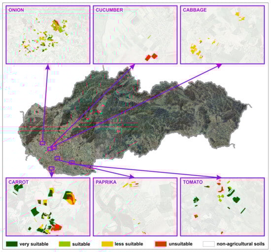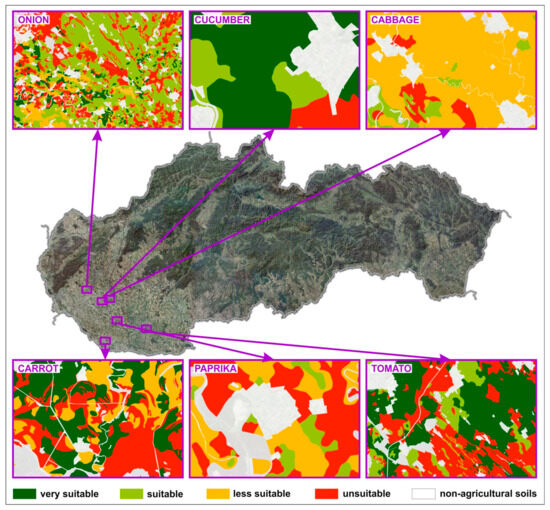 In contrast to many other studies, this research primarily focused on identifying suitable locations and regions (rather than substrates) for vegetable cultivation in Slovakia. Using available databases and pedogeographic data in vector format, we identified such areas and visualized them through maps. We also highlighted both consistencies and discrepancies between the potential and actual selection of areas for vegetable production. It was confirmed as a result of the analysis that the requirements of individual vegetable species regarding soil properties are highly variable. In general, however, vegetables thrive in warmer climatic regions with deep, stone-free, medium-textured (loam) soils on flat terrain, with a well-balanced water–air regime and a finely–lumpy soil structure.