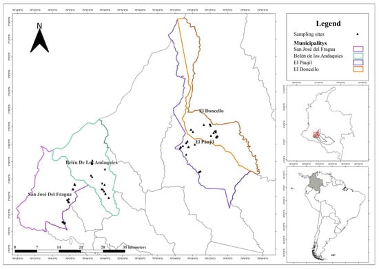 Location of sampling sites in the department of Caquetá, Colombia.
