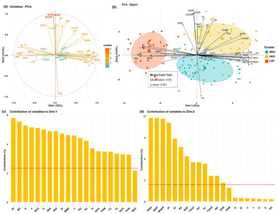 Principal Component Analysis (PCA) projection of physical, hydrological, and agronomic variables in soils under cocoa-based agroforestry systems in the Amazonian piedmont: (a) correlation circle between the different evaluated variables; (b) soil typologies under cocoa-based agroforestry systems; (c,d) variables with the highest contribution in components 1 and 2 (variables above the red line have a statistically significant contribution; p < 0.05). The gradient from red to green indicates a contribution level from higher to lower. i. Sandy loam, with high drainage capacity and productivity (HDP). ii. Sandy clay loam with medium structural stability (MSS). iii. Sandy clay loam with low structural stability and productivity (LSP). AAI, aggregate aggregation index; BA, biogenic aggregates %; BD, bulk density; C, clay; FC, field capacity; HG, gravimetric humidity; Infil, infiltration; K, soil erodibility; Ks, saturated hydraulic conductivity; MaG, macro-aggregates; MeG, meso-aggregates; MiG, micro-aggregates; NA%, non aggregates %; OA, organic aggregates %; PA, physical aggregates %; PR, penetration resistance; RA, root aggregates %; RD, real density; S, sand; Si, silt; SSA, structural stability of aggregates; St, structural stability index; TP total porosity; Tr, residual volumetric water content; Ts, saturated volumetric water content; VESS, Visual Evaluation of Soil Structure; WMD, weighted mean diameter; a, relationship between matrix pressure and water content; n, shape of the water retention curve; GI, grain index; HI1, harvest index1; HI2, harvest index2; NGP, number of grains per pod; PD, pod diameter; PFW, pod fresh weight; PHW, pod husk weight; PI, pod index; PL, pod length; WGD, dry grain weight; WGP, weight of grains per pod; WGPP, weight of grain plus placenta; Yield1; Grain yield1; Yield2; Grain yield2. The variables above the red dashed lines explain most of the variance in the principal components.
