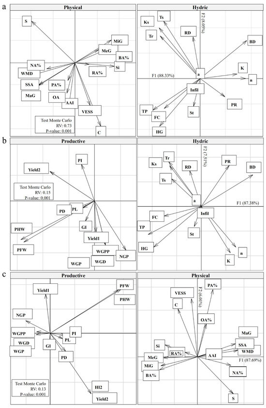 Figure 5 shows the relationships between the matrices of physical and hydrological variables, as well as between these and productive variables. The relationship between physical and hydrological variables was high with an RV of 0.73 (p < 0.001, Figure 5a). In the case of agronomic variables in relation to hydraulic and physical variables, the RV was 0.15 and 0.13 (p < 0.001, Figure 5b,c).