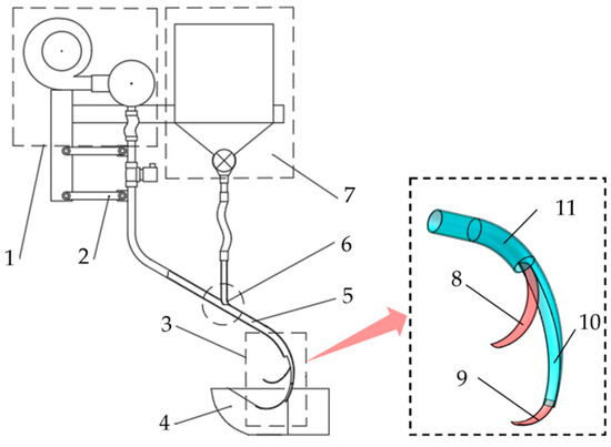 Overall structure of the pneumatic deep fertilization device for paddy fields. 1. Air supply system; 2. profiling mechanism; 3. air–fertilizer separator; 4. water divider; 5. fertilizer acceleration tube; 6. air–fertilizer mixing interface; 7. fertilizer metering system; 8. primary air-diverting arc plate; 9. secondary air-diverting arc plate; 10. arc-shaped trough; 11. air–fertilizer separation arc-shaped tube (AFAST).