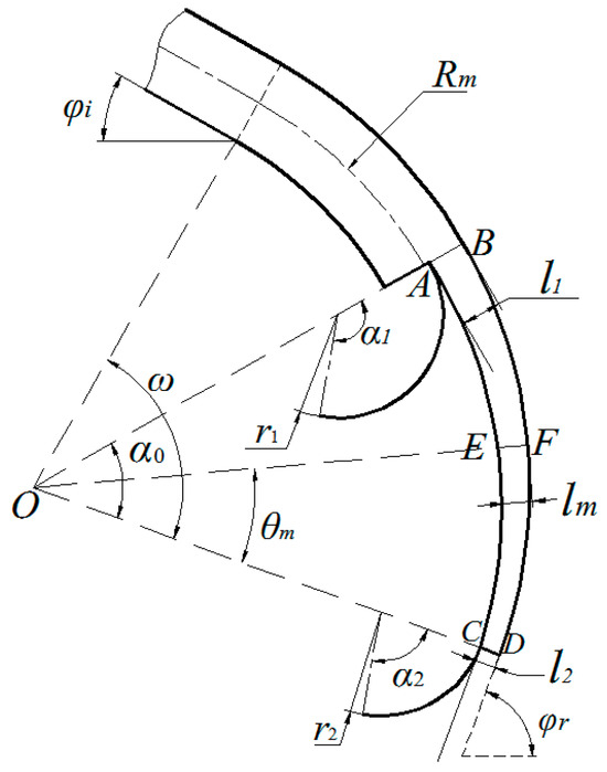 OF is the bisector of the central angle of the arc-shaped trough. Point E is located on the line segment OF. The length of EF is half of the sum of the depths of arc-shaped troughs l1 and l2. In cutting off the inner part along the circular path through points A, E, and C, the resultant arc-shaped trough is made to match the requirements of the outlet dimensions and central angle.