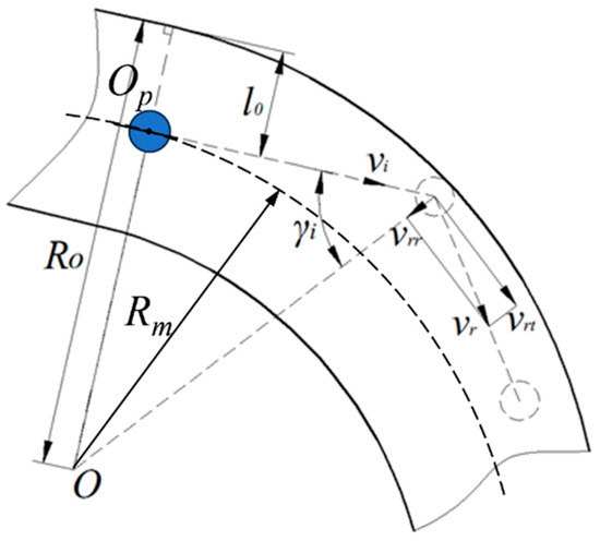 The motion of the fertilizer particle entering into the arc-shaped air–fertilizer separation tube. R0 is the radius of the back wall of AFAST; Rm is the arc radius of AFAST center line; l0 is the distance between the initial incident position of the fertilizer particles and the back wall of AFAST, m; Op is the center of the fertilizer particle; O is the center of the separator; γi is the angle between the direction of the incident speed of the fertilizer particles and OOp; vi is the incident speed of the fertilizer particles; vr is the rebound velocity of the fertilizer particles; vrr is the radial rebound velocity of the fertilizer particles; vrt is the tangential rebound velocity of the fertilizer particles.