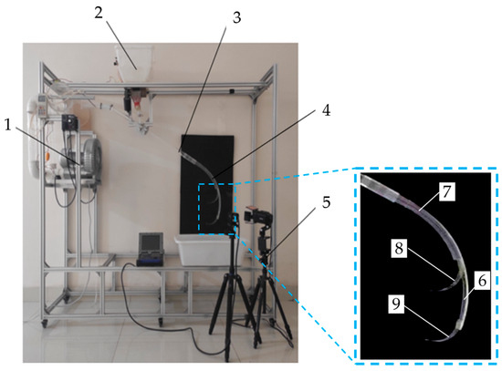 Air–fertilizer separator performance test bench. 1. Fan; 2. fertilizer feeder; 3. acceleration tube; 4. separation tube; 5. high-speed dynamic image analyzer; 6. arc-shaped trough; 7. AFAST; 8. primary air-diverting arc plate; 9. secondary air-diverting arc plate.