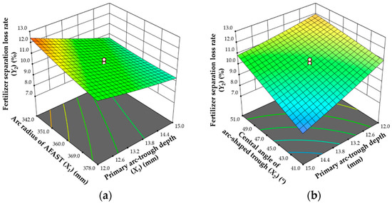 Effects of various factors on fertilizer separation loss rate. (a) The interaction between the primary arc-trough depth and arc radius of arc-shaped tube; (b) the interaction between the primary arc-trough depth and central angle of arc-shaped trough.