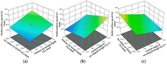 Influence of various factors on outlet airflow speed. (a) The interaction between the primary arc-trough depth and arc radius of arc-shaped tube; (b) the interaction between the primary arc-trough depth and central angle of arc-shaped trough; (c) the interaction between the arc radius of AFAST and the central angle of the arc-shaped trough.