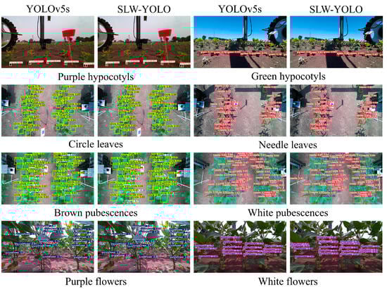 - A hybrid soybean parent phenotypic consistency detection model, SLW-YOLO, was established based on the YOLOv5s network. The model achieved the following: F1 score: 92.3%; mAP: 94.8%; detection speed: 88.3 FPS; and model size: 45.1 MB. Compared to the YOLOv5s model, SLW-YOLO showed improvements in F1 score by 6.1% and mAP by 5.4%, while the detection speed decreased by 42.1 FPS and the model size increased by 31.4 MB.