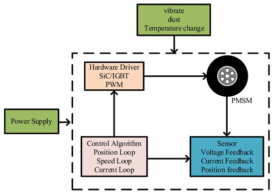 The PMSM drive system, comprising the motor, power converter, and controller (as shown in Figure 1), serves as the core powertrain for an increasing number of agricultural machines, from electric tractors and seeders to combine harvesters. These systems must operate reliably under the exceptionally demanding and unpredictable conditions of the farm environment. Key challenges include sudden ±70% soil resistance mutations during tillage or seeding, extreme ambient temperature variations (−40 to 85 °C) from season to season and region to region, strong electromagnetic interference from various onboard equipment, persistent broadband vibration (3–500 Hz) generated by uneven terrain and implements, and exposure to corrosive agents like acidic mud and fertilizer. These factors collectively push the drive system to its limits, threatening both hardware integrity and control stability. Factors such as high voltage, large current, and temperature cause a decline in the reliability of the power converter, whose reliability determines the continuous and reliable operation capability of agricultural machinery. Furthermore, the sophistication of the control algorithms ultimately determines the system’s ability to translate raw power into precise, efficient, and high-quality agronomic outcomes. The performance of these algorithms is therefore not merely an engineering metric but a direct determinant of agricultural operational quality, influencing factors such as seeding depth uniformity, harvesting efficiency, and overall yield [].