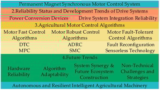 Furthermore, robust control strategies with strong disturbance rejection capabilities also have their limitations: the high-frequency chattering of SMC exacerbates mechanical wear, while the Extended State Observer (ESO) of ADRC is prone to amplifying noise under high gain, weakening system stability. Crucially, when multi-stress coupling effects like vibration, drastic temperature changes (−40~85 °C), and corrosion act on the drive system, the lack of a synergistic mechanism between fast control (dynamic response), robust control (disturbance rejection and stabilization), and fault-tolerant control (fault reconfiguration) in existing control architectures makes it difficult to build a closed-loop protection system of “disturbance suppression—fault isolation—dynamic reconfiguration”. Under such complex conditions, the robust layer may fail to compensate for key performance degradation (e.g., torque loss) in time, the fault-tolerant layer struggles to dynamically reconfigure the system state and accurately acquire necessary information (e.g., rotor position and speed), and the fast layer loses control due to inaccurate commands, potentially leading to system collapse. This systemic failure profoundly reveals the core disconnect in current research: control theory mostly focuses on single-algorithm optimization in laboratory environments, while agricultural engineering emphasizes local hardware improvements, both failing to establish a collaborative model that accurately captures the strong coupling dynamic relationship of “motor-load-environment” [,,]. Figure 2 shows the overall flowchart of the article.