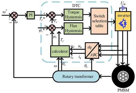 Unlike vector control technology, DTC uses Bang-Bang control to generate PWM signals, optimally controlling the inverter’s switching states to achieve high dynamic performance in torque. DTC abandons the decoupling idea in traditional vector control, replacing rotor flux orientation with stator flux orientation and eliminating rotating coordinate transformations. This not only reduces the computational burden but also weakens the system’s dependence on motor parameters, effectively mitigating the impact of motor parameter variations on operational performance. This characteristic is particularly valuable for electric tractors, where load torque can fluctuate violently due to changing soil conditions, helping to maintain traction and prevent wheel slip [].