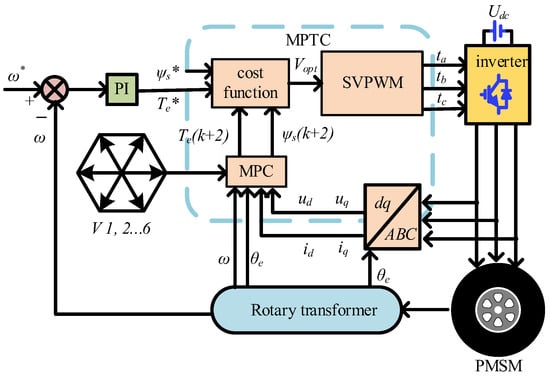 where ψs is the stator flux linkage, Te is the electromagnetic torque, λψ is the weighting coefficient. Its control block diagram is shown in Figure 5. Therefore, compared with traditional control strategies, MPC exhibits significant advantages in multiple aspects: Its core lies in the ability to flexibly configure weighting coefficients in the cost function, enabling collaborative optimization of multiple objectives such as torque and flux tracking accuracy, switching losses, and current harmonic suppression. Simultaneously, it explicitly handles physical constraints (voltage, current, torque) during the rolling optimization process, effectively enhancing system safety. Furthermore, the mechanism of prospectively generating optimal voltage vector sequences based on the prediction model significantly improves system dynamic response speed (response time can be shortened by about 30% compared to FOC), thereby better suppressing speed fluctuations caused by sudden soil resistance changes. Particularly important is that MPC does not rely on a precise decoupled motor model; it predicts future behavior by discretizing the system state, exhibiting stronger adaptability and robustness to parameter drift during operation.