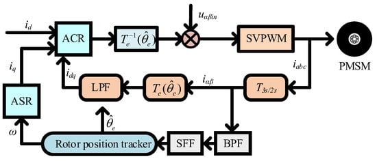 Block diagram of a sensorless control system for PMSM based on rotating high-frequency voltage signal injection.