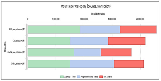 After preprocessing the raw reads, a de novo transcriptome was reconstructed from 5,969,174 transcripts using the combined sequenced libraries from the four biological samples. The de novo transcriptome yielded 16,211 longer contigs representing 13,450 unique genes. The de novo supertranscriptome is available in Table S1. The de novo supertranscriptome, also known as TSA (Transcriptome Shootgun Assembly), is a computer-assembled archive of transcript sequences derived from primary data, such as raw reads (Sequence Read Archive—SRA) (see Data Availability Statement). The supertranscriptome was blasted, mapped, and annotated to identify individual contigs and associate actual biological functions with genes expressed during the treatments. Then, in the RNA-sequencing read quantification step, the gene expression levels per treatment were determined individually, yielding a count table (Table S1). Based on the data, approximately 70% of the raw reads aligned to the de novo transcriptome (Figure 1).