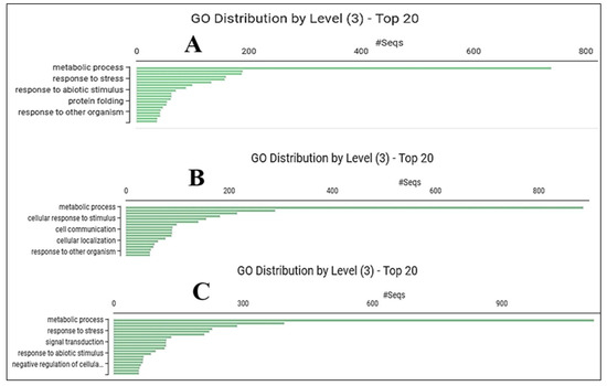 Gene enrichment analyses identified 1360 over- and 2354 under-represented genes between the control and drought stress treatments, 1630 over- and 1946 under-represented genes between the control and GABA primed treatments, and 2088 over- and 1803 under-represented genes in the drought stress and GABA primed + drought stress datasets. Pairwise differential expression analysis of control and drought-stressed plant populations showed that drought stress activated not only basic biological metabolic processes but also processes involved in stress responses (Figure 2A). In the case of GABA-priming, the highest activation was realized in the cellular response to stimulus in addition to basic metabolic pathways (Figure 2B). It is also noteworthy that in the case of plants treated with the combined treatment, stress responses, signal transduction processes, and responses to abiotic stimuli were activated in addition to metabolic processes (Figure 2C).