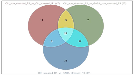 It can also be stated that in the case of the mentioned pathways, 11 enzymes were activated exclusively under drought stress, 7 exclusively under the influence of weaker, stimulating GABA-priming, and 31 exclusively in plants previously treated with priming and then exposed to drought for a longer period of time. In addition, activation of 22 enzymes was observed in all three treatments. In addition, 5, 9 and 27 enzymes overlapped between one, the other or the third treatment pairs (Figure 3). The results suggest that the same biochemical pathways are activated in the perception of the two different abiotic stress and in plant responses to it, but within the pathways, there are unique differences between the genes involved in the processes and the metabolic products they activate.
