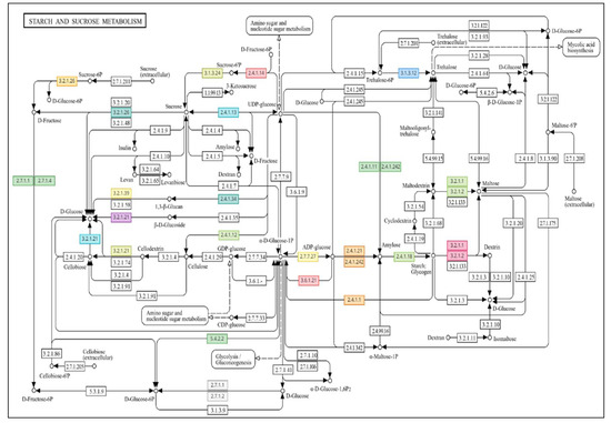 In addition, it can be stated that the GABA priming treatment can indeed be perceived as a mild eustress, which causes the plant to make acclimation (short-term) responses, which responses are preserved in the long-term in the plant stress memory and can be reactivated during a possible later stress. During the later activation, a stronger immune response from the plants can be observed, which is presumably due to the help of the prior priming treatment. The most active biochemical pathway was starch and sucrose metabolism, in which 16 upregulated genes activated a total of 15 enzymes under drought stress (Table S8); 25 genes activated 19 enzymes under GABA priming (Table S9), while 28 upregulated genes transcribed in GABA primed and subsequently drought-stressed plants activated 22 enzymes (Figure 4).
