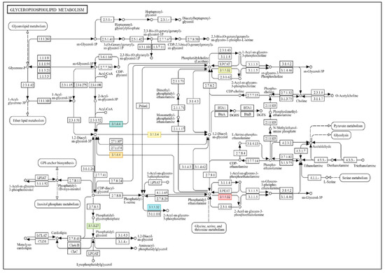 Drought stress treatments and GABA priming on glycerophospholipid metabolism enzymes. The figure was created using OmicsBox 3.4′s Combined Pathway Analysis tool (https://www.biobam.com/omicsbox/) and accessed on 22 August 2025 as-is. Genes initiate subprocesses, as seen in the picture. The names represent all EC coded genes and enzymes (Table 2) that operate the biochemical pathway. Red items indicate substantial treatment modifications.